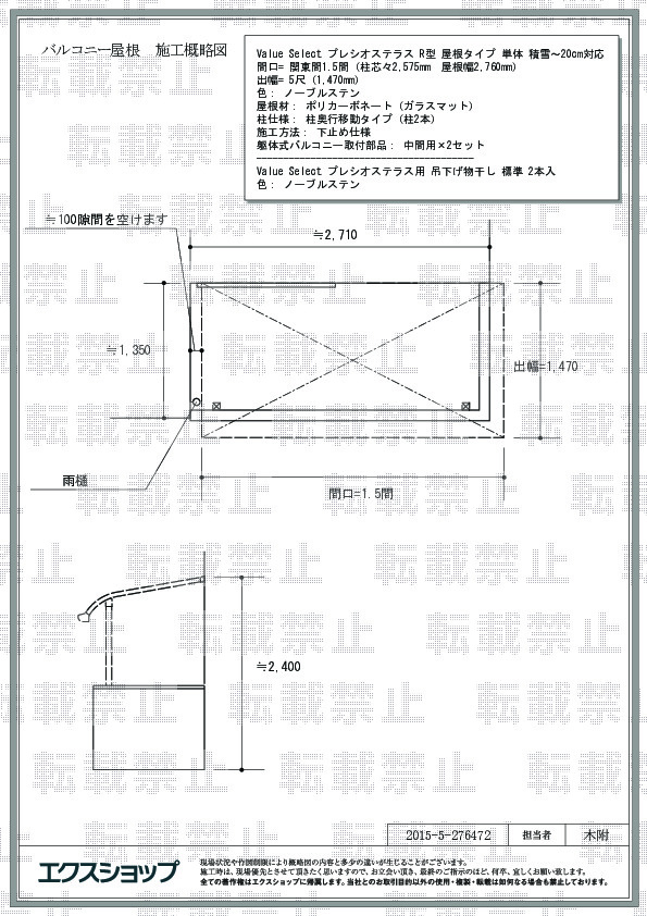 | サイズ | 屋根幅 2,760mm 出幅 1,470mm |