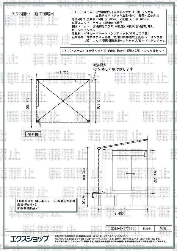![兵庫県神戸市のLIXIL リクシル(トステム)のテラス囲い・サンルーム [片袖納まり]ほせるんですII F型 ランマ有 土間納まり(デッキ上取付け) 積雪〜20cm対応+内部日除け(1.5間×9尺)・フック棒セット 施工例](/public/img/img_voice/user_img_large/2015-5-277360-01.webp)