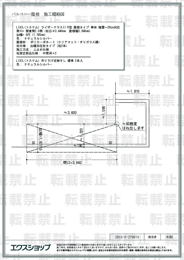 | サイズ | 屋根幅 3,660mm 出幅 1,785mm |