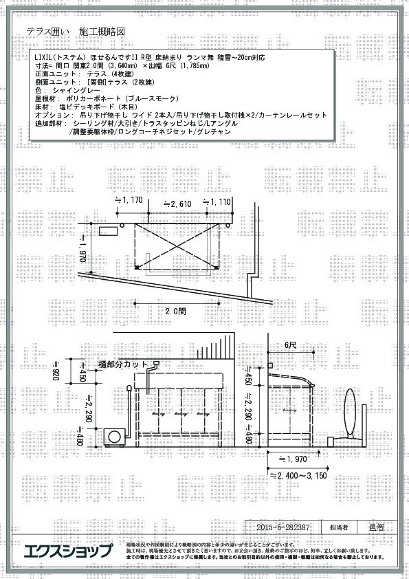 この度はほせるんですII R型 床納まり の施工をご依頼頂き、誠に有り難うございます。再度弊社を信頼し施工をご依頼頂きましたこと、大変嬉しく存じます。木目調の床材を使用したテラス囲いは、まるでもう一つお部屋が増えたような、素敵なお仕上がりでございますね。お洗濯物干し場やご家族皆様の団欒の場として、末永くご愛用頂けますと幸いでございます。これからもお客様に更にお喜び頂けるサービスのご提供が出来るよう、エクスショップは日々精進して参ります。また機会がございましたら、是非弊社にご用命くださいますよう、宜しくお願い致します。
