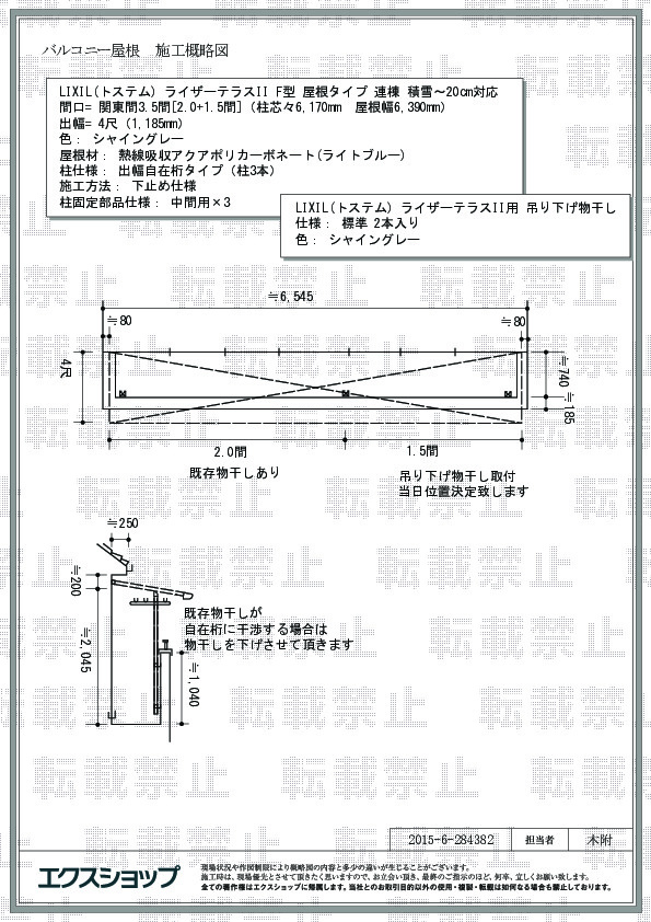 この度は、ライザーテラスII F型 屋根タイプ 連棟の施工をご依頼頂きまして、誠に有り難うございます。雨や鳥の糞から洗濯物をお守りしますので、バルコニーを有効に活用して頂けますかと存じます。また熱線吸収アクアポリカーボネート(ライトブルー)の屋根が直射日光や紫外線を遮り、真夏の家事も快適に行って頂けます。今後も弊社は、エクステリアの施工を通しまして、お客様にゆとりある暮らしづくりのご提案をさせて頂きます。またの機会がございましたら、是非お気軽にエクスショップにご用命下さいますよう、宜しくお願い申し上げます。