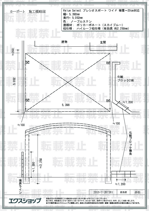 この度はプレシオスポート ワイドの施工をご依頼頂きまして、誠に有り難うございます。お客様にご満足頂ける施工が完成いたしましたこと、担当した施工士はもとより私どもと致しましても大変嬉しく感じております。スカイブルーの屋根により青みがかった陰がとても爽やかでございますね。今後もお客様に笑顔をお届けできますようエクスショップは益々精進して参ります。またのご利用を心よりお待ちしております。