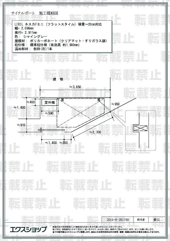 この度はネスカFミニの施工をご依頼頂きまして、誠に有り難うございます。土地の形状に合わせて加工された屋根が、スッキリと外観もとても自然な納まりでございますね。これからは雨濡れによる自転車の錆も防止出来、美しさを永く保つことが出来るものと存じます。今後もお客様に笑顔をお届けできますようエクスショップは益々精進して参ります。またのご利用を心よりお待ちしております。