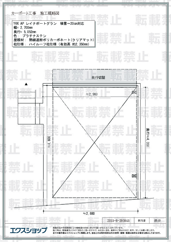 昨年購入した車両は高さが2,250mmあり構造的にルーフには乗れず、洗車がとても大変で苦労していました。現在3連のカーポートはありますが高さが2,400mmの所があり納まりません。高さがクリアーできるカーポートを探した所エクスショップに辿り着きました。価格、保証等説明を聞き、クチコミにも後押しされ決めさせて頂きました。現地調査も準則にして頂き設置も近くの業者様により、2日で完了しました。設置後雨が降りましたが、車両が濡れないため雨垂れ等無くとても満足しております。また機会がありましたらその際は是非お願いしたいと思います。大変有り難う御座いました。