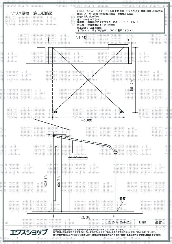 数多くございますショップの中からエクスショップをお選び頂きましたこと、弊社スタッフの対応にお褒めの言葉をお寄せ頂きましたこと、大変嬉しく存じます。ライザーテラスII R型 1500 テラスタイプが綺麗に納まり、お住まいの外観を損なわないお仕上がりでございますね。雨や紫外線、太陽の熱を遮る機能的なテラス屋根の完成により、お客様の暮らしが更に便利で快適なものとなりますことを、願っております。この度はエクスショップをご利用頂き、誠に有り難うございました。またのご利用を心よりお待ち申し上げております。