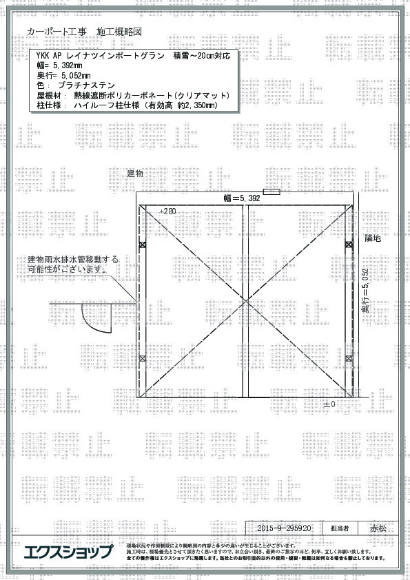 レイナツインポートグランの施工をエクスショップにご依頼頂き、誠に有り難うございます。熱線遮断ポリカーボネート(クリアマット)の屋根がお車を優しく包み込み、霜や雨などによる汚れが軽減されるものと存じます。今回施工した商品で、お客様の快適な生活のサポートができますことを、願っております。施工日程の調整にお時間を頂き、申し訳ございませんでした。今後は更に迅速で丁寧な対応ができますよう、より一層努力を重ねて参ります。貴重なご意見をお寄せ頂き、有り難うございました。