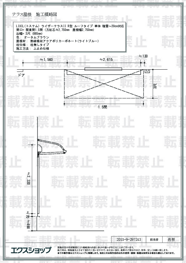 | サイズ | 屋根幅 2,750mm 出幅 885mm |