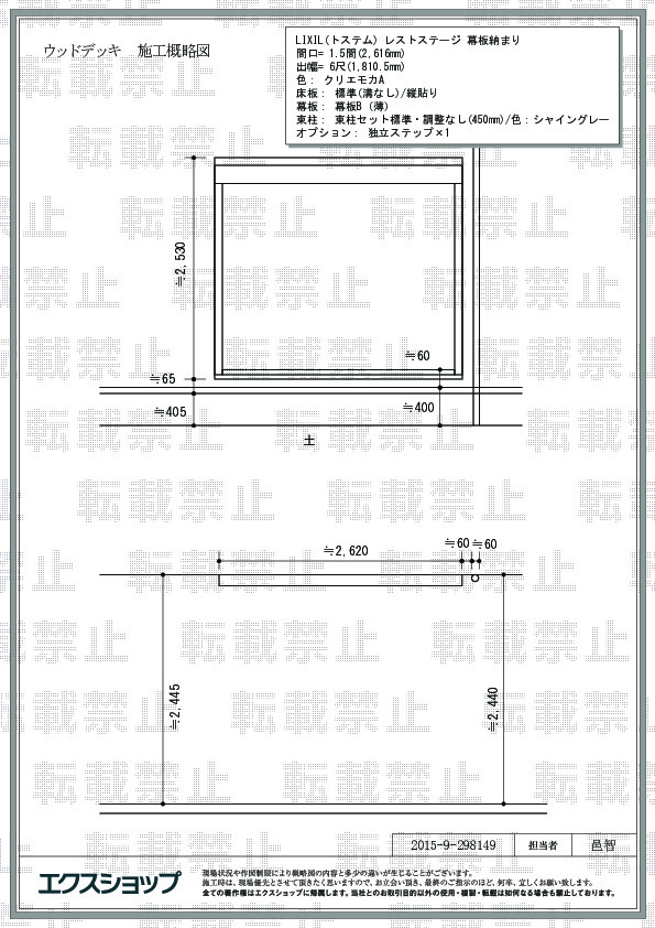 数多くございますショップの中からエクスショップをお選び頂き、誠に有り難うございます。広々としたレストステージは、お洗濯物干し場やお子様の遊び場に最適でございますね。天然木粉配合した床材は、干割れやささくれがなく、優れた耐久性と耐候性を備えておりますので、長期間安心してご愛用頂けるものと存じます。これからもお客様に安心してご利用頂けるショップを目指して、スタッフ一同精進して参ります。またのご利用を心よりお待ち申し上げております。
