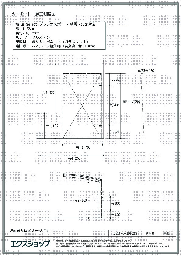 プレシオスポート の施工をご依頼頂きまして、誠に有り難うございます。ポリカーボネート(ガラスマット)の屋根が、雨や埃だけではなく、紫外線も遮りますので、新しいお車をいつも美しい状態で使用して頂けるものと存じます。担当致しました施工士もご期待にお応えすることが出来、大変喜んでおります。今後も変わらず、お客様の満足の為に精進して参りますので、また機会がございましたら、お気軽にエクスショップにご用命くださいますよう宜しくお願い致します。