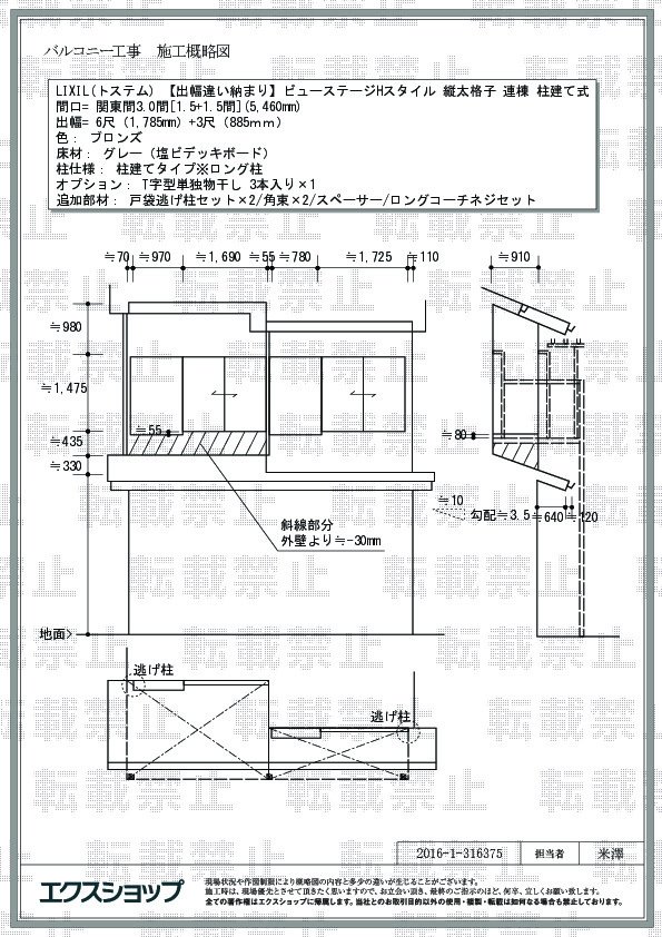 ビューステージHスタイル 縦太格子 連棟の施工のご依頼を頂きまして、誠に有り難うございます。お住まいの外観を損ねる事なくバルコニーが完成し、スッキリとした収まり具合でございますね。お洗濯物を干して頂く際にも安心して干して頂け、安全にお使い頂けるものと存じますので、お気に召して頂き、永くご愛用頂けますと幸いでございます。これからもお客様のご期待に応えられるよう、スタッフ一同努力を重ねて参りますので、また機会がございましたら、是非エクスショップにご用命頂きますよう、宜しくお願い申し上げます。