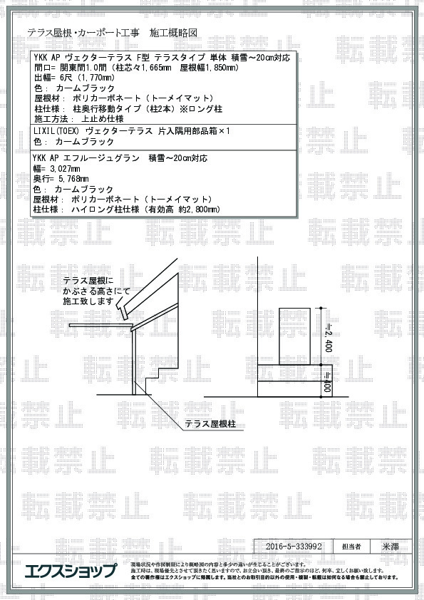 この度は、ヴェクターテラス F型 テラスタイプ、並びにエフルージュグランの施工をご依頼頂きまして誠に有り難うございました。雨天時にも気兼ねなく、快適にご利用頂けることと存じます。また価格面で当社を選んで頂きありがとうございました。これからも、お客様のご期待を裏切らないよう精進して参りますので、また機会がございましたら、是非エクスショップをご利用して頂きますよう、宜しくお願い致します。