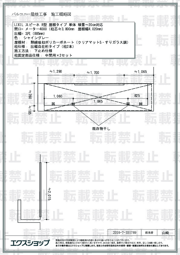 スピーネ R型 屋根タイプの施工をご依頼頂きまして、誠に有り難うございます。アール型にカーブした屋根がしっかりと雨風の吹込みを防ぎますが、光を通す熱線吸収ポリカーボネート(クリアマットS・すりガラス調)の屋根でございますので、明るさはそのままでございますね。お洗濯物を干したままでも、安心して外出して頂けるものと存じます。今後も変わらず、お客様の満足の為に精進して参りますので、また機会がございましたら、お気軽にエクスショップにご用命くださいますよう宜しくお願い致します。