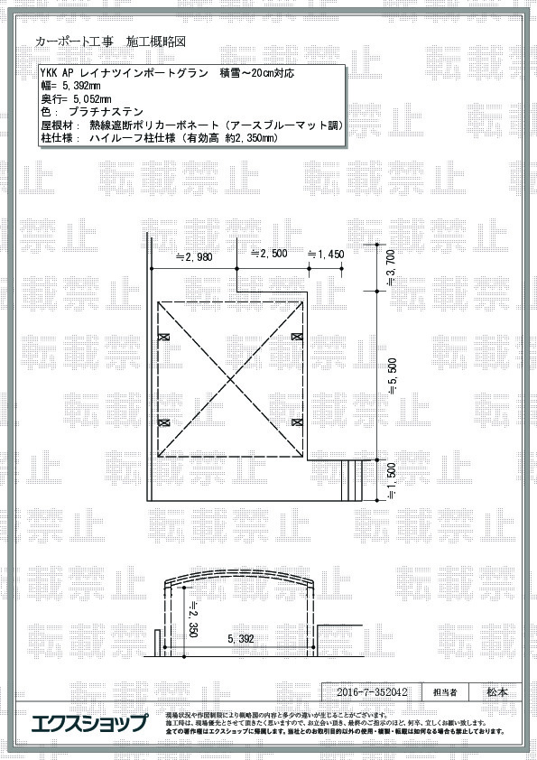 昨年購入した車両は高さが2,250mmあり構造的にルーフには乗れず、洗車がとても大変で苦労していました。現在3連のカーポートはありますが高さが2,400mmの所があり納まりません。高さがクリアーできるカーポートを探した所エクスショップに辿り着きました。価格、保証等説明を聞き、クチコミにも後押しされ決めさせて頂きました。現地調査も準則にして頂き設置も近くの業者様により、2日で完了しました。設置後雨が降りましたが、車両が濡れないため雨垂れ等無くとても満足しております。また機会がありましたらその際は是非お願いしたいと思います。大変有り難う御座いました。