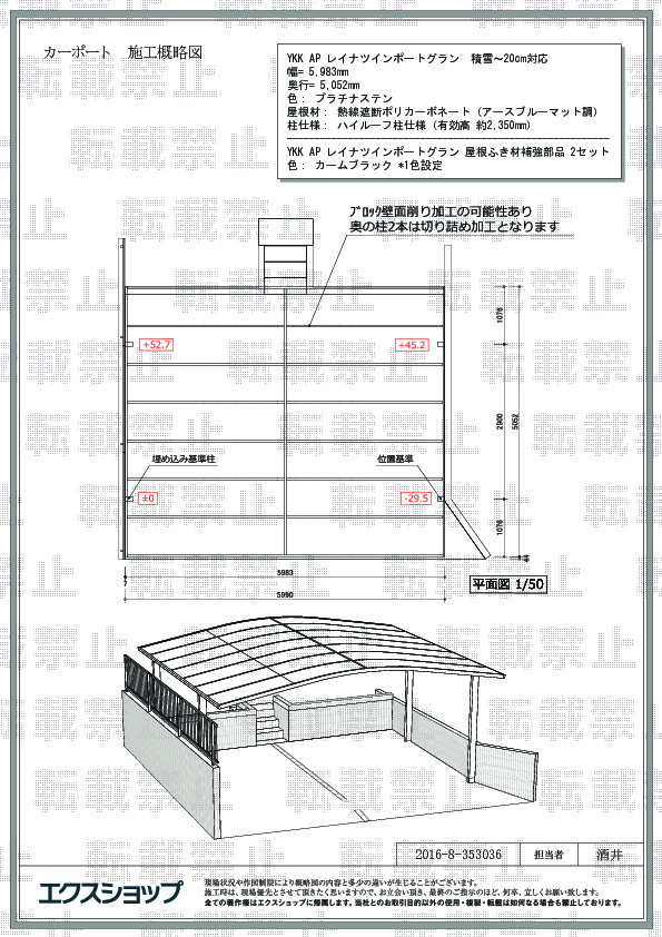 レイナツインポートグランの施工をご依頼頂きまして、誠に有り難うございます。熱線遮断ポリカーボネート(クリアマット)の屋根がカースペース全体を覆っており、お車や自転車をとめられても安心でございますね。雨の日の乗り降りの際も傘を差す必要がなく、お荷物の多い時など重宝して頂けるものと存じます。今後も絶えず企業努力を続け、丁寧にそして迅速に対応できますよう、スタッフ一同、努めて参ります。また機会がございましたら、是非エクスショップにご用命頂きますよう、宜しくお願い致します。