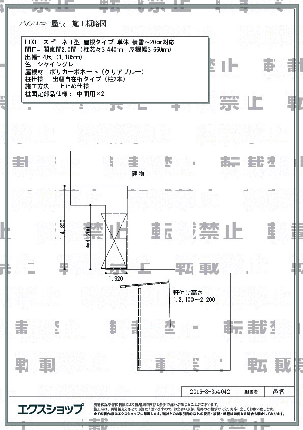 | サイズ | 屋根幅 3,660mm 出幅 1,185mm |