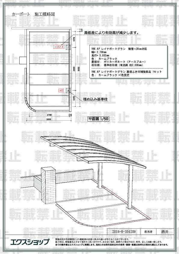 昨年購入した車両は高さが2,250mmあり構造的にルーフには乗れず、洗車がとても大変で苦労していました。現在3連のカーポートはありますが高さが2,400mmの所があり納まりません。高さがクリアーできるカーポートを探した所エクスショップに辿り着きました。価格、保証等説明を聞き、クチコミにも後押しされ決めさせて頂きました。現地調査も準則にして頂き設置も近くの業者様により、2日で完了しました。設置後雨が降りましたが、車両が濡れないため雨垂れ等無くとても満足しております。また機会がありましたらその際は是非お願いしたいと思います。大変有り難う御座いました。