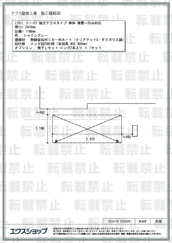フーゴF 独立テラスタイプの施工をご依頼頂きまして、誠に有り難うございます。弊社のホームページを見てご依頼頂き、お仕上がりにご満足頂きましたこと、大変嬉しく存じます。雨がかからないので、安心してお洗濯物を干して頂く事が出来、熱線吸収ポリカーボネート(クリアマットS・すりガラス調)の屋根材は熱も遮るため、室温の上昇も抑えられるものと存じます。これからも、このようなお喜びのお言葉を励みに、さらにご満足頂けるエクスショップを目指して、努力して参りたいと存じます。またのご利用を、心よりお待ち申し上げております。