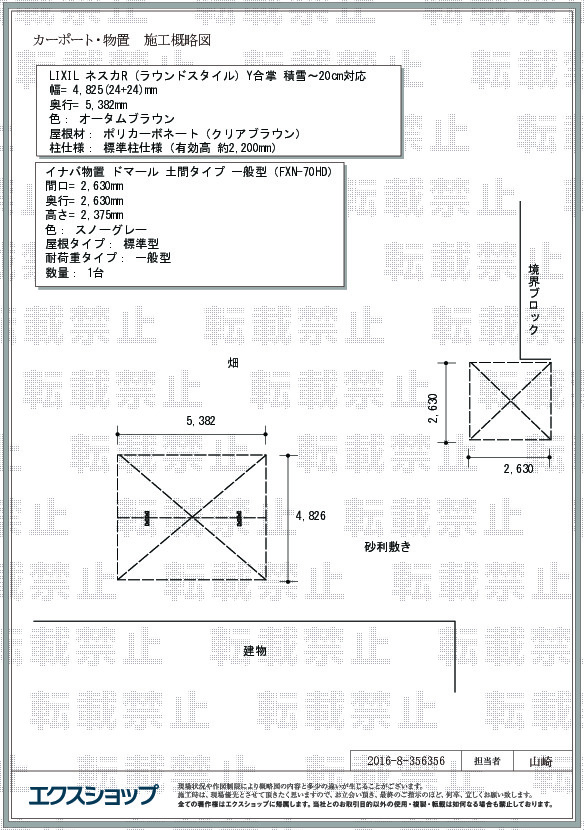 ネスカR (ラウンドスタイル) Y合掌と物置の施工をご依頼頂きまして、誠に有り難うございます。柱が中央部分にまとまっているため、お車も楽に駐車して頂けますね。担当致しました施工士もご期待にお応えすることが出来、大変喜んでおります。これからも、エクスショップをご利用頂いた、全てのお客様に、安心と満足をお届けすることが出来ますよう、日々精進して参りたいと存じます。この度のご利用、誠に有り難うございました。