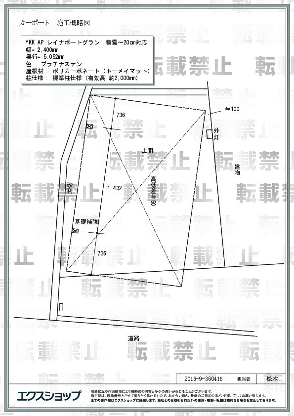 レイナポートグランの施工をご依頼頂きまして、誠に有り難うございます。プラチナステンのフレームとポリカーボネート(トーメイマット)の屋根材との取り合わせが、爽やかで、美しいお仕上がりでございますね。担当致しました施工士もご期待にお応えすることが出来、大変喜んでおります。今後も変わらず、お客様の満足の為に精進して参りますので、また機会がございましたら、お気軽にエクスショップにご用命くださいますよう宜しくお願い致します。