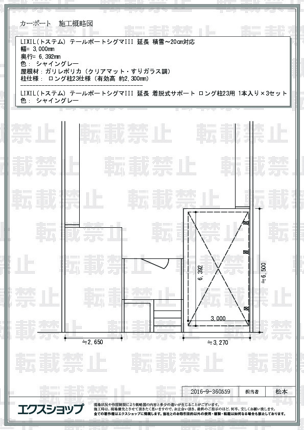 テールポートシグマIII 延長の施工をご依頼頂きまして、誠に有り難うございます。ご自宅のカースペースをすっかり覆い、お車にも優しいカーポートでございますね。雨による汚れや直射日光による傷みが軽減され、お車をいつも美しく保つことが出来るものと存じます。これからも、お客様の笑顔の為に日々努力して参りますので、また、機会がございましたら、是非エクスショップをご利用頂きますよう、宜しくお願い致します。この度のご利用、誠に有り難うございました。
