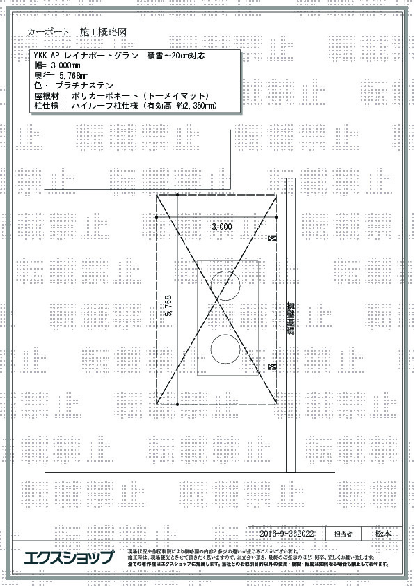 昨年購入した車両は高さが2,250mmあり構造的にルーフには乗れず、洗車がとても大変で苦労していました。現在3連のカーポートはありますが高さが2,400mmの所があり納まりません。高さがクリアーできるカーポートを探した所エクスショップに辿り着きました。価格、保証等説明を聞き、クチコミにも後押しされ決めさせて頂きました。現地調査も準則にして頂き設置も近くの業者様により、2日で完了しました。設置後雨が降りましたが、車両が濡れないため雨垂れ等無くとても満足しております。また機会がありましたらその際は是非お願いしたいと思います。大変有り難う御座いました。