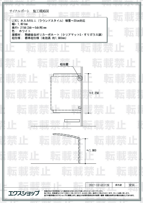 この度は弊社でネスカRミニ (ラウンドスタイル) の施工のご依頼を頂きまして、誠に有り難うございます。ホワイトカラーの爽やかで明るいサイクルポートがお住まいの外観にマッチし、綺麗に収まりました事、喜ばしく存じます。大切な自転車を雨や有害な紫外線から守り、快適にお使い頂けるものと存じます。当商品をお気に召して頂き、永くご愛用頂けますと幸いでございます。これからもお客様の快適な生活を作るお手伝いが出来るよう、スタッフ一同努力を重ねて参りますので、また機会がございましたら、是非エクスショップにご用命頂きますよう、宜しくお願い申し上げます。