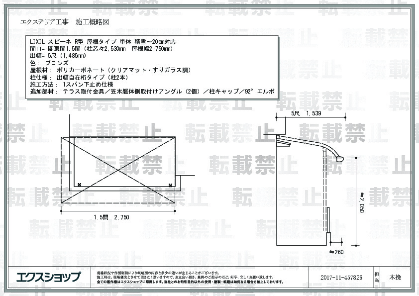 | サイズ | 屋根幅 2,750mm 出幅 1,485mm |