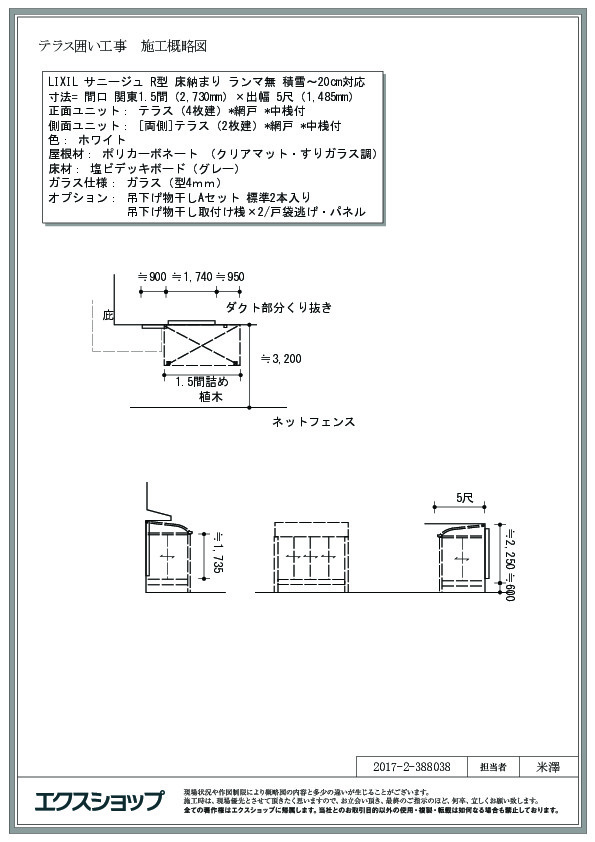 この度は弊社でサニージュ R型の施工のご依頼を頂きまして、誠に有り難うございます。後付けには感じられない程自然に収まりましたテラス囲いは、お部屋が一つ増えたような感覚で使って頂け、お洗濯物は勿論、ご趣味を楽しんで頂くスペースとしても便利にお使い頂けるものと存じます。これからもお客様一人一人に合った施工の提案が出来るよう、スタッフ一同努力を重ねて参りますので、また機会がございましたら、是非エクスショップにご用命頂きますよう、宜しくお願い申し上げます。