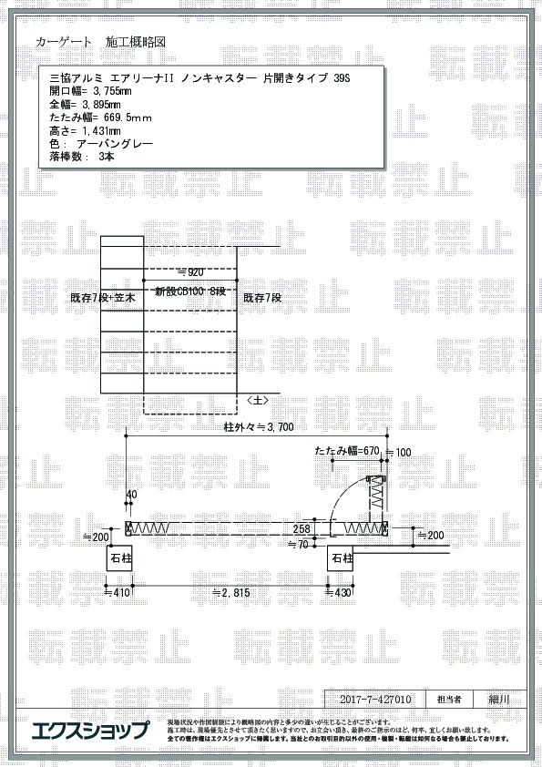弊社でエアリーナIIの施工のご依頼を頂きまして、誠に有り難うございます。お庭の景観を損ねる事なく、アーバングレーの光沢のあるカーゲートがスッキリと収まりました事、嬉しく存じます。この度の施工に不備がございました事、大変申し訳ございませんでした。また施工後の清掃が徹底出来ておらず、ご迷惑をお掛けしました事、重ねてお詫び申し上げます。今後はこのような事がなきよう、施工前の確認、施工後の清掃を徹底して参る所存でございます。これからもエクスショップをご愛顧頂きますよう、宜しくお願い申し上げます。