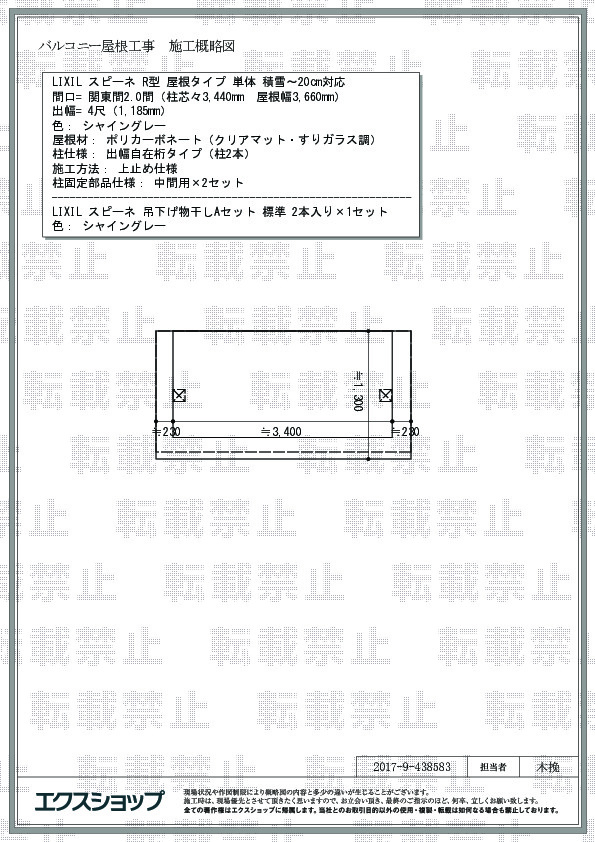 この度は弊社でスピーネ R型 屋根タイプの施工のご依頼を頂きまして、誠に有り難うございます。バルコニーのスペースにスッキリと収まりましたバルコニー屋根は、後付けには感じられない程自然なお仕上がりでございますね。雨天時にも安心してお洗濯物を干して頂けるものと存じます。見積もりに提示にお時間を頂きました事、お詫び申し上げます。今後は出来る限り早く見積もりの提案が出来るよう、スタッフ一同努力して参りますので、また機会がございましたら、是非エクスショップにご用命頂きますよう、宜しくお願い申し上げます。