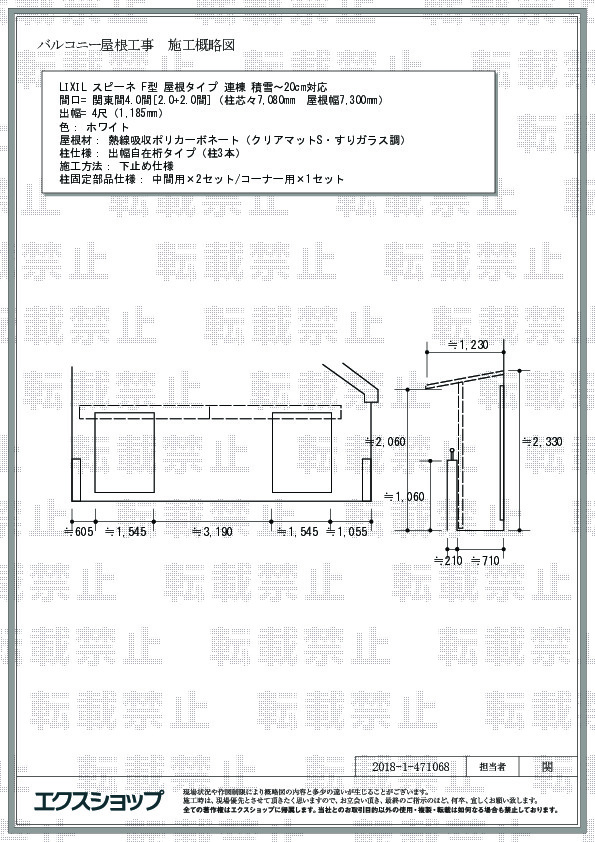 | サイズ | 屋根幅 7,300mm 出幅 1,185mm |