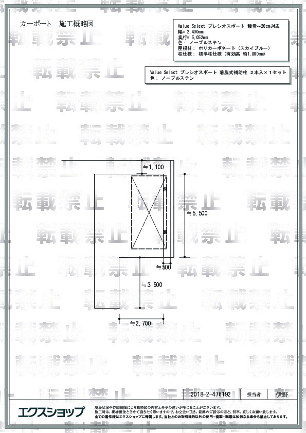エクスショップのオリジナル商品でございますプレシオスポートの施工をご依頼頂きまして、誠に有り難うございます。ポリカーボネート(スカイブルー)の屋根材が、雨や直射日光を遮り、夏場の車内温度の上昇、冬場のフロントガラスの凍結、並びに、雨天時のお車の汚れなど、お車に関する多くの悩みが解消されるものと存じます。天候に関係なく、お車でのお出掛けを楽しんで頂けますね。これからも、お客様の笑顔の為に日々努力して参りますので、また、機会がございましたら、是非エクスショップをご利用頂きますよう、宜しくお願い致します。