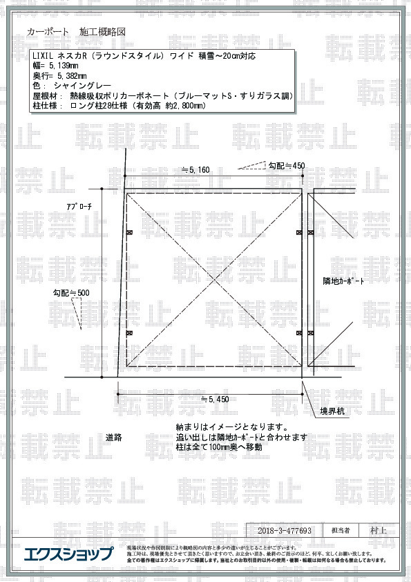 昨年購入した車両は高さが2,250mmあり構造的にルーフには乗れず、洗車がとても大変で苦労していました。現在3連のカーポートはありますが高さが2,400mmの所があり納まりません。高さがクリアーできるカーポートを探した所エクスショップに辿り着きました。価格、保証等説明を聞き、クチコミにも後押しされ決めさせて頂きました。現地調査も準則にして頂き設置も近くの業者様により、2日で完了しました。設置後雨が降りましたが、車両が濡れないため雨垂れ等無くとても満足しております。また機会がありましたらその際は是非お願いしたいと思います。大変有り難う御座いました。