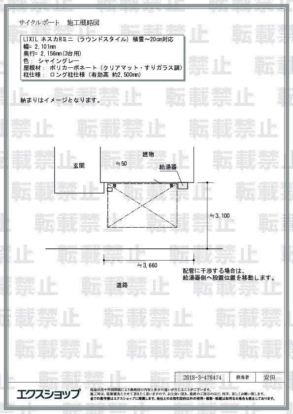 この度は弊社でネスカRミニ (ラウンドスタイル)の施工のご依頼を頂きまして、誠に有り難うございます。コンパクトなサイクルポートが玄関横のスペースに完成し、既存のサッシに干渉する事なく綺麗に収まりました事、喜ばしく存じます。雨や有害な紫外線から自転車を守り、雨天時にも安心して駐輪して頂けますので、当商品をお気に召して頂き、永くご愛用頂けますと幸いでございます。これからもエクステリアを通して、お客様に笑顔溢れる快適な暮らしをお届け出来るよう、スタッフ一同日々精進して参りますので、また機会がございましたら、是非エクスショップにご用命頂きますよう、宜しくお願い申し上げます。