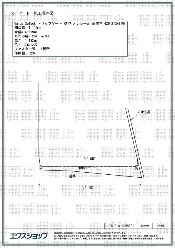 トリップゲート RA型の施工をご依頼頂きまして、誠に有り難うございます。カーゲートの一流メーカーとエクスショップが協同で開発致しましたトリップゲート は、お手頃な価格ではございますが、機能性、耐久性は一流メーカー品と遜色ございませんので、安心してご使用頂けるものと存じます。カーゲートがリニューアルされ、防犯面でも安心してお過ごし頂けるものと存じます。今後も、格安のお値段での最高品質の商品の提供にこだわって参りたいと存じます。.また機会がございましたら是非、弊社にご用命くださいますよう宜しくお願い申し上げます。
