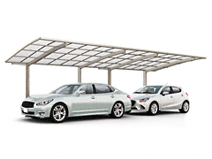 フーゴ R 900 1台用 縦2連棟 縦連棟(ラウンドスタイル)は片側に構成された4本の支柱が特徴の縦向きに並んで収納ができるカーポートです。3色のカラーと6種類の屋根材を組み合わせて選べます。積雪に対する性能を保証し、30cmまで対応可能で、耐風性能はVo=38m/sの基準風速を保持。