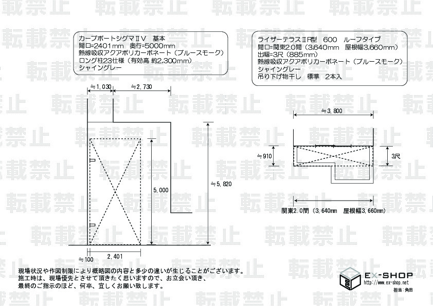 | サイズ | 柱芯々 3,640mm 屋根幅 3,660mm 出幅 885mm |