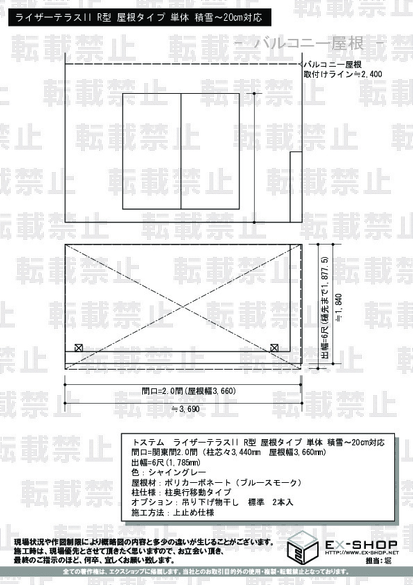 サイズ | 屋根幅 3,660mm 出幅 1,785mm |