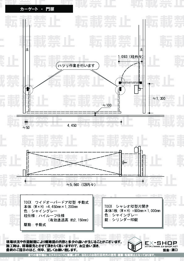 最初はカーポートだけ施工して頂くつもりでおりましたが、初回の打ち合わせ時の説明等が丁寧かつ明瞭でしたので、かねてより考えていたものの決定に至らなかったカーゲート門扉の方も施工して頂くことに致しました。結果としてすべての施工が満足いくものであり今後も機会がありましたらエクスショップさんを利用させて頂きたいと思います。