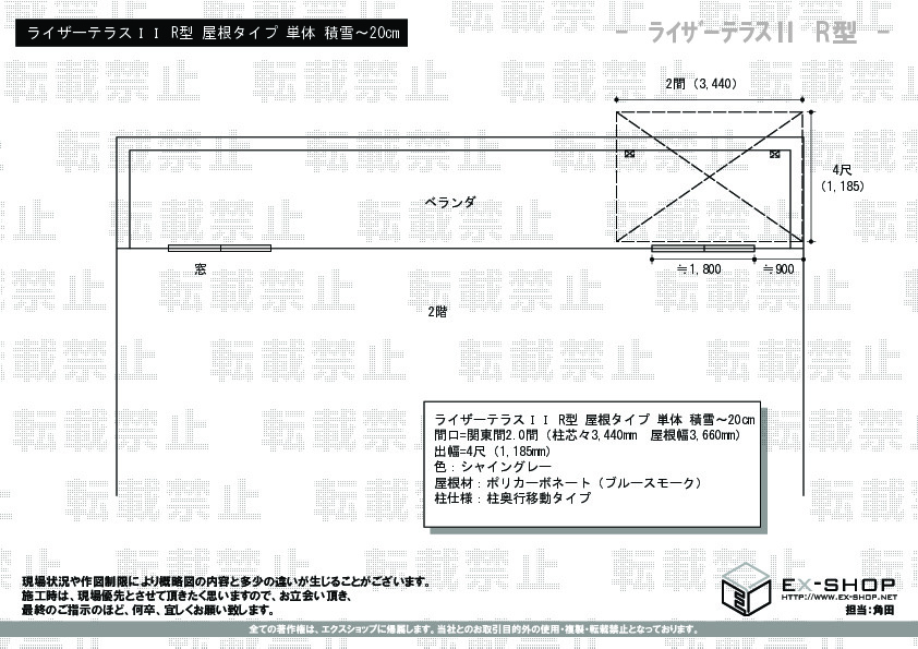 | サイズ | 屋根幅 3,660mm 出幅 1,185mm |