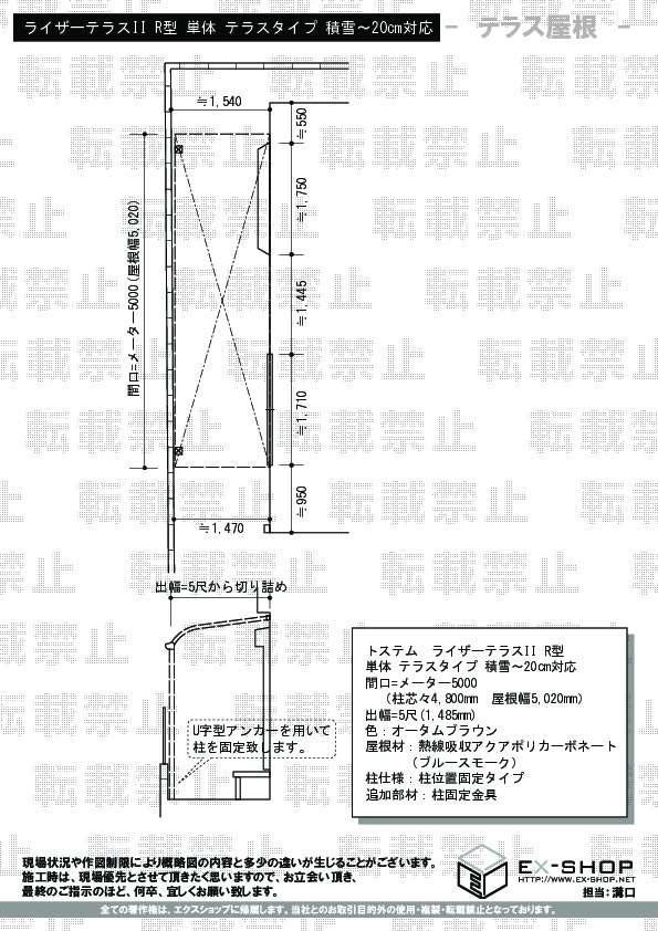 サイズ | 柱芯々 4,800mm 屋根幅 5,020mm 出幅 1,485mm |