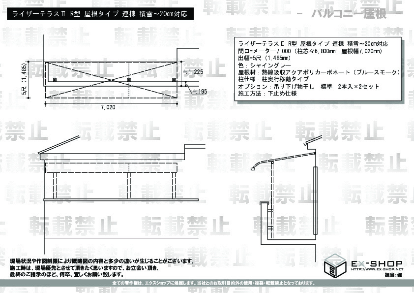 サイズ | 屋根幅 7,020mm 出幅 1,485mm |
