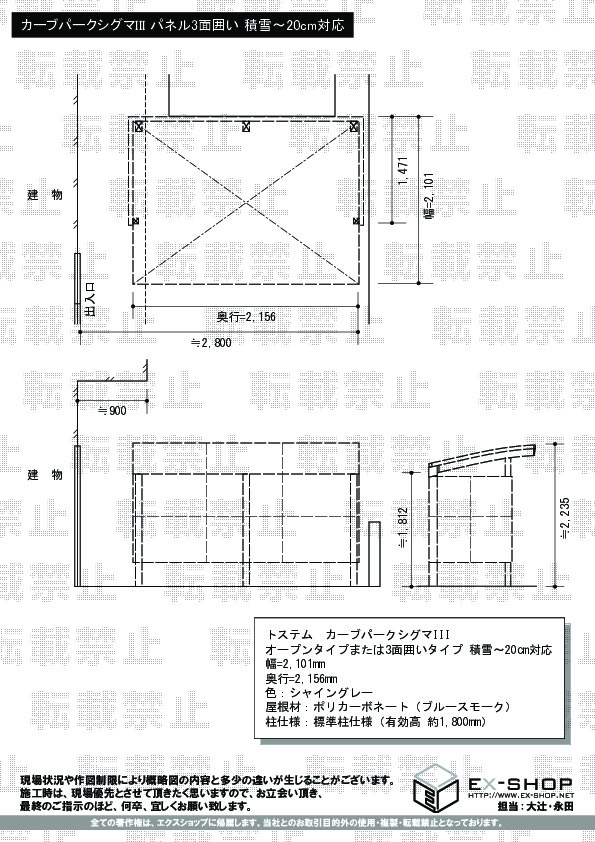 | 屋根材等 | ポリカーボネート(ブルースモーク) |