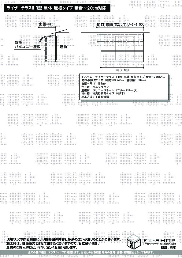 サイズ | 屋根幅 3,660mm 出幅 1,185mm |