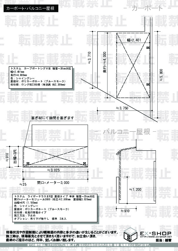 サイズ | 屋根幅 3,020mm 出幅 1,185mm |