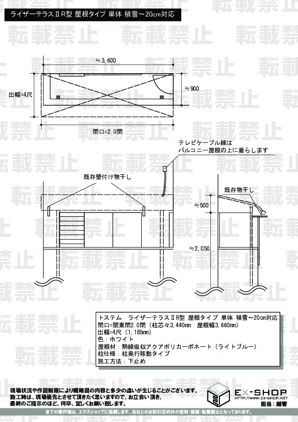 | サイズ | 屋根幅 3,660mm 出幅 1,185mm |