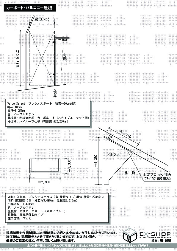 プレシオステラスU R型 屋根タイプ 単体はエクスショップオリジナルブランドのアール屋根タイプのバルコニー屋根です。間口3サイズ・出幅5サイズからの選択ができます。屋根は曲線型のアール仕様で、3色からお選びいただけます。