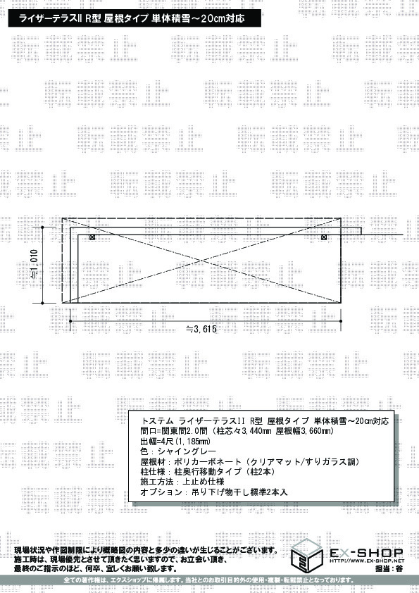 サイズ | 屋根幅 3,660mm 出幅 1,185mm |