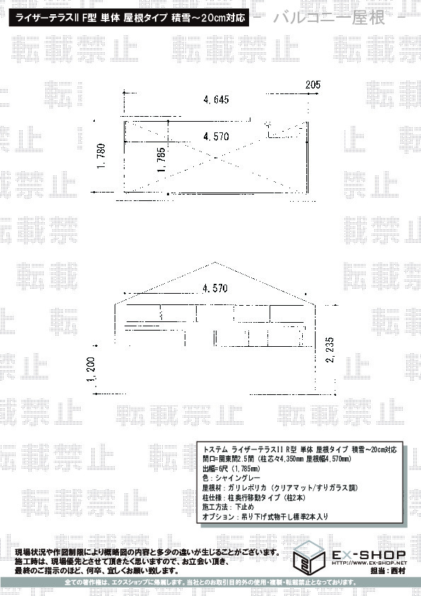| サイズ | 屋根幅 4,570mm 出幅 1,785mm |