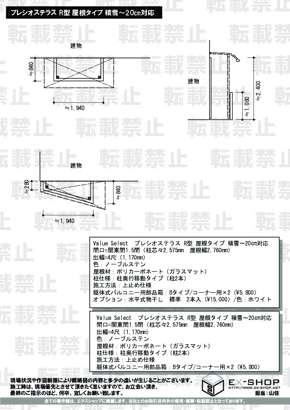 プレシオステラスU R型 屋根タイプ 単体はエクスショップオリジナルブランドのアール屋根タイプのバルコニー屋根です。間口3サイズ・出幅5サイズからの選択ができます。屋根は曲線型のアール仕様で、3色からお選びいただけます。